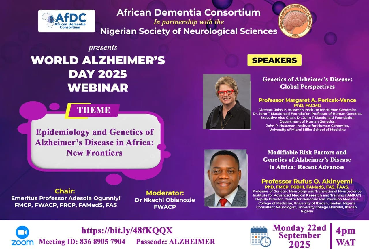 The African Dementia Consortium (AfDC) in collaboration with the Nigerian Society of Neurological Sciences (NSNS) celebrates the World Alzheimer’s Month 2025, with a webinar on the ” Epidemiology and Genetics of Alzheimer’s Disease in Africa “. Join us as we explore new frontiers to understanding the genetics of AD in Africa. Let us come together to learn, understand, share and build innovations to reduce the burden of Dementia in Africa.