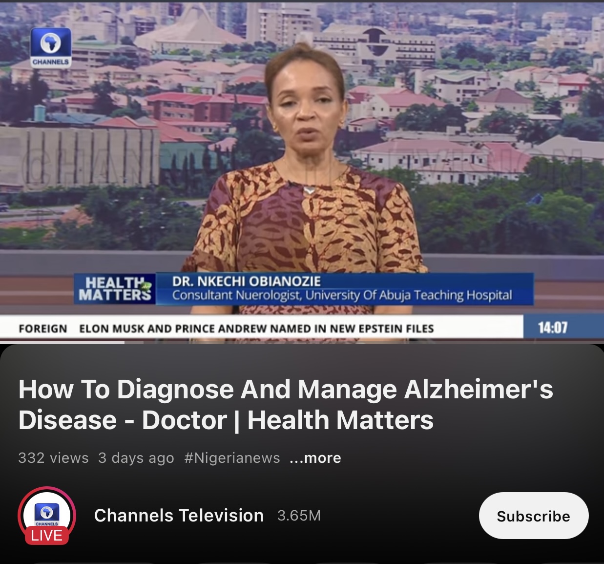 A major news outlet in Nigeria interviewed Dr. Nkechi Obianozie, a Consultant Neurologist of the University of Abuja Teaching Hospital on “Understanding the symptoms and management of Alzheimer’s disease” for World Alzheimer’s Month and for the Nigerian Team.